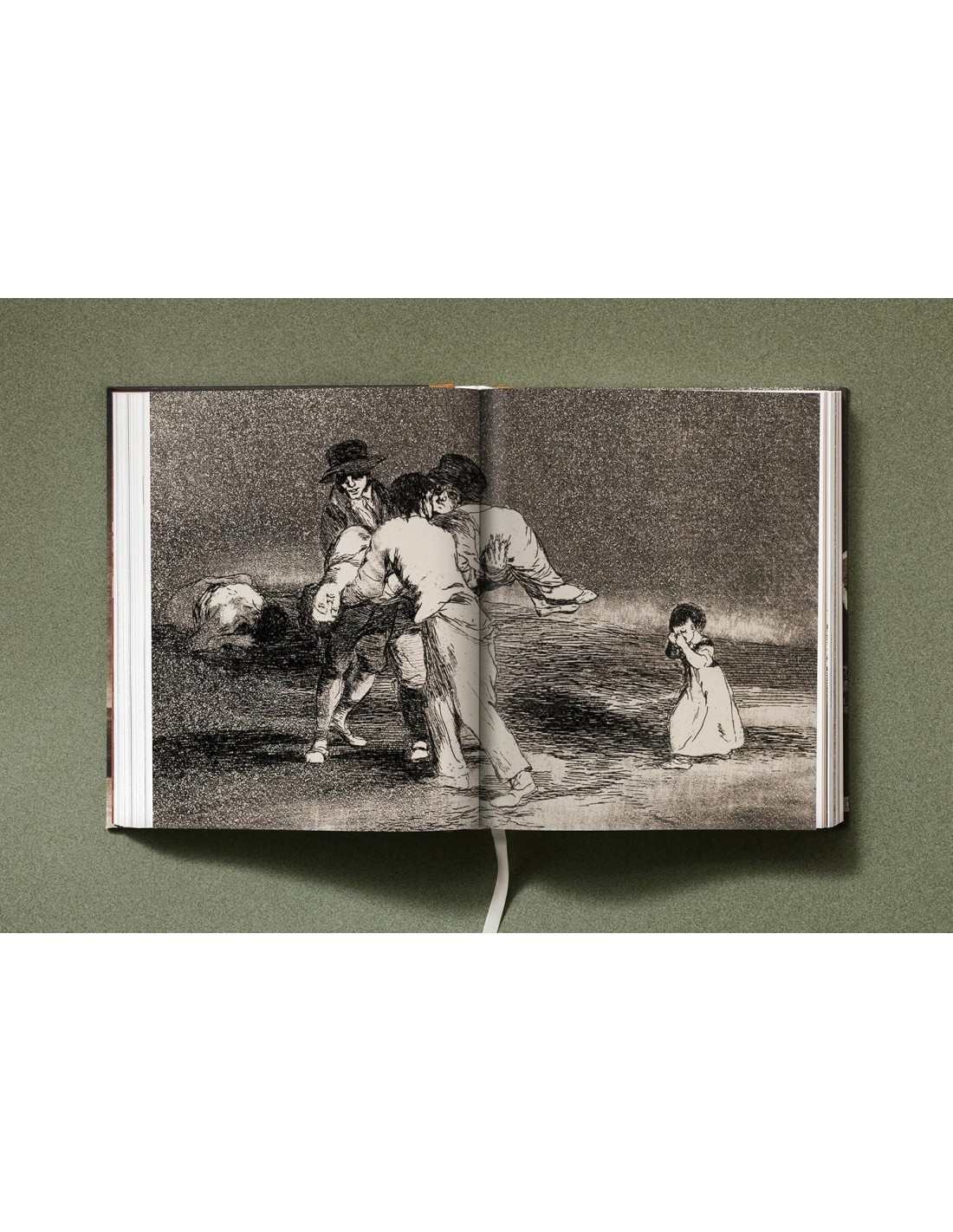 Ya fuera en estampas sueltas ―como la desgarradora El agarrotado o el sublime Gigante sentado― o a lo largo de sus célebres series ―los satíricos Caprichos, los desgarradores Desastres de la guerra, la crónica de la Tauromaquia y los enigmáticos Disparates―, Goya plasmó tanto el espíritu como las sombras de un mundo en convulsión, donde el individuo se veía a menudo arrollado por la violencia, la superstición o el poder. Estas no eran solo reflexiones sobre la sociedad española. Eran acusaciones, meditaciones y advertencias grabadas en cobre sobre la esencia universal del ser humano. Esta emblemática colección de 287 aguafuertes y litografías reúne la obra gráfica completa de Goya, e incluye ediciones realizadas bajo su supervisión directa, así como raras pruebas de estado que ofrecen una perspectiva excepcional de su incansable experimentación y de su meticuloso control del proceso de grabado. Con un comentario detallado de cada imagen y ensayos de José Manuel Matilla y Anna Reuter, este volumen es una puesta al día de más de dos siglos de investigación académica y ofrece una interpretación visual reveladora de su obra gráfica.