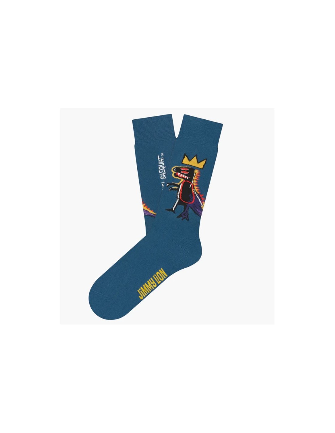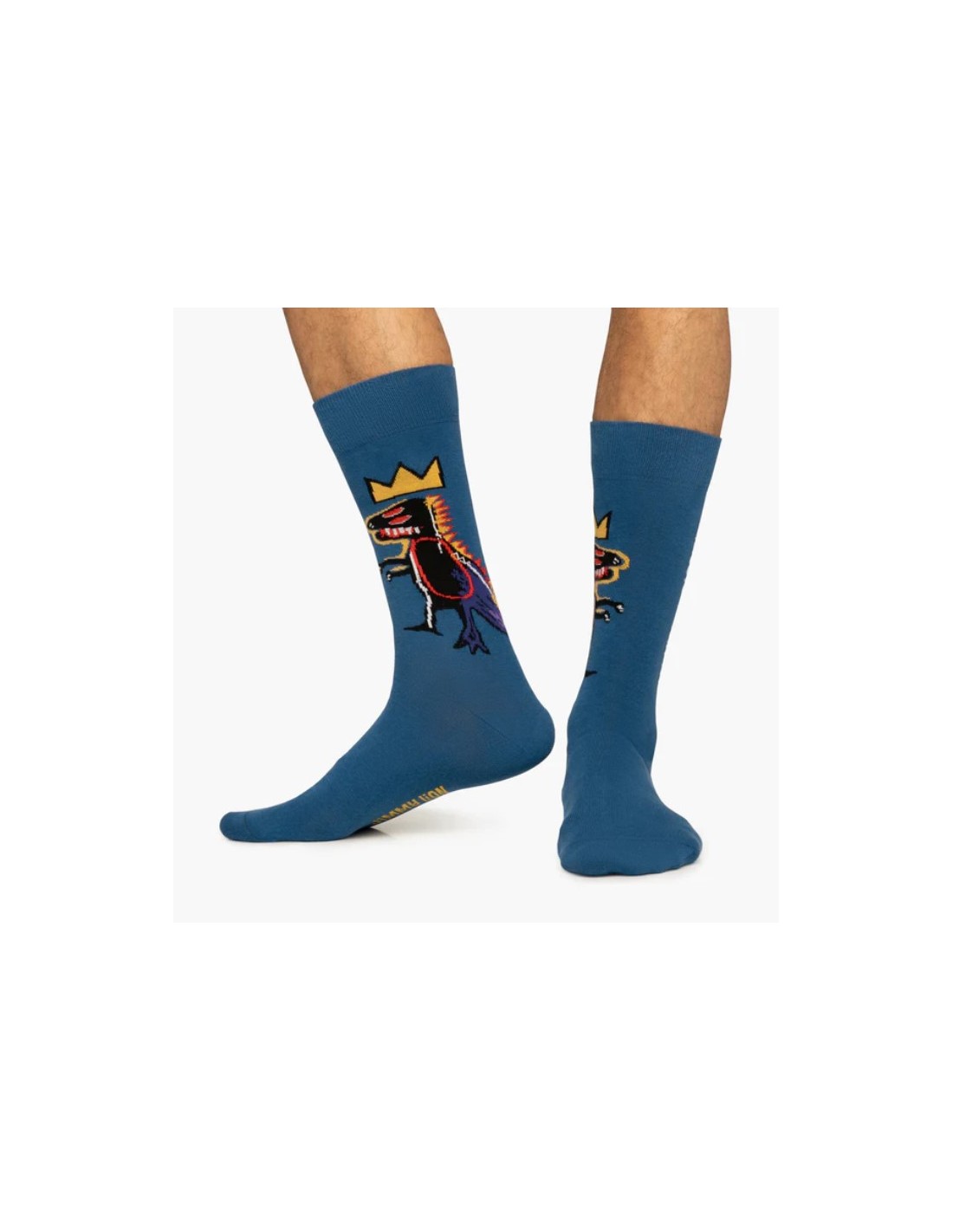 El diseño de estos calcetines presenta el famoso dinosaurio con su corona de tres puntas, uno de los símbolos más emblemáticos en la obra de Basquiat. Este detalle visual, junto con las figuras abstractas y los trazos espontáneos, captura perfectamente la energía cruda y libre que definió el trabajo de Basquiat. Además, la firma del propio artista en la parte interior del calcetín hace que estos calcetines sean aún más exclusivos y auténticos, un pequeño guiño al arte que podrás llevar siempre contigo.