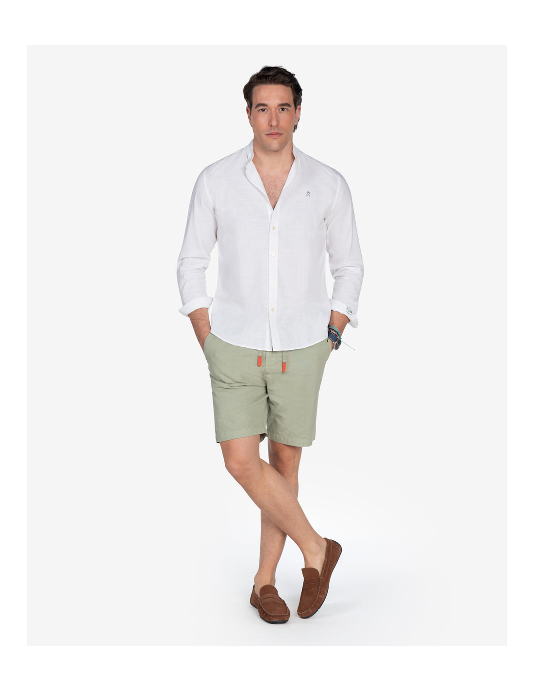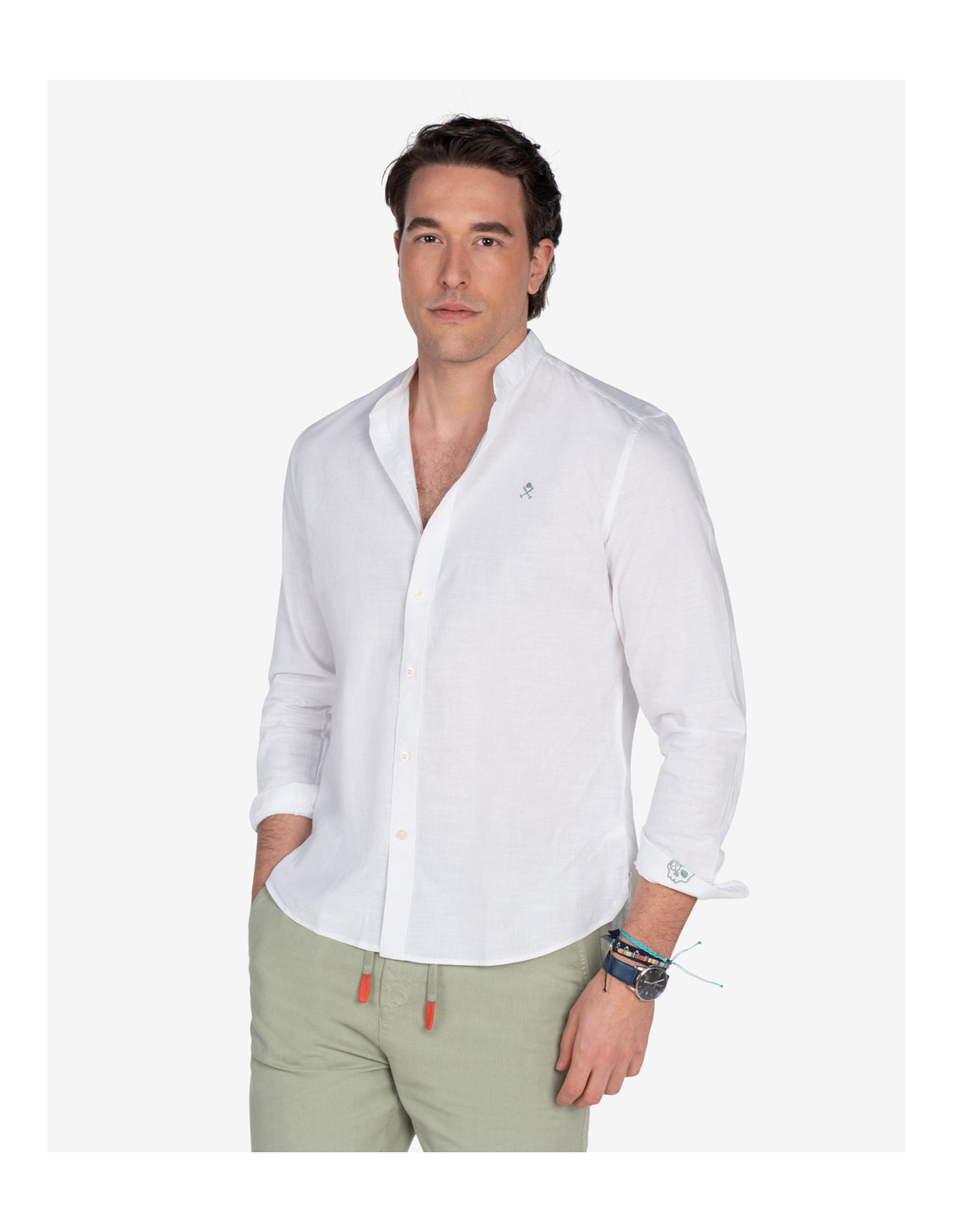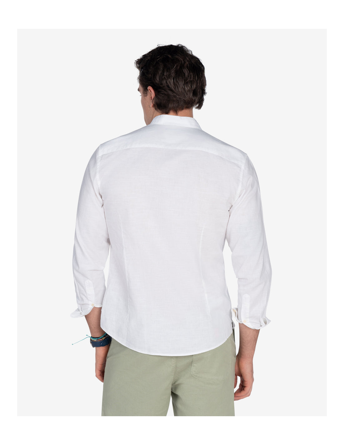 Su distintivo cuello mao le confiere un aire moderno y minimalista, diferenciándola de las camisas tradicionales. Este camisa de lino y algodón cuello mao hombre es ideal para quienes buscan un estilo menos formal pero igualmente elegante. El diseño de manga larga la hace versátil, permitiéndote enrollar las mangas para un look más casual o llevarlas extendidas para un acabado más pulido. El cierre de botones a tono complementa el diseño limpio de la camisa.