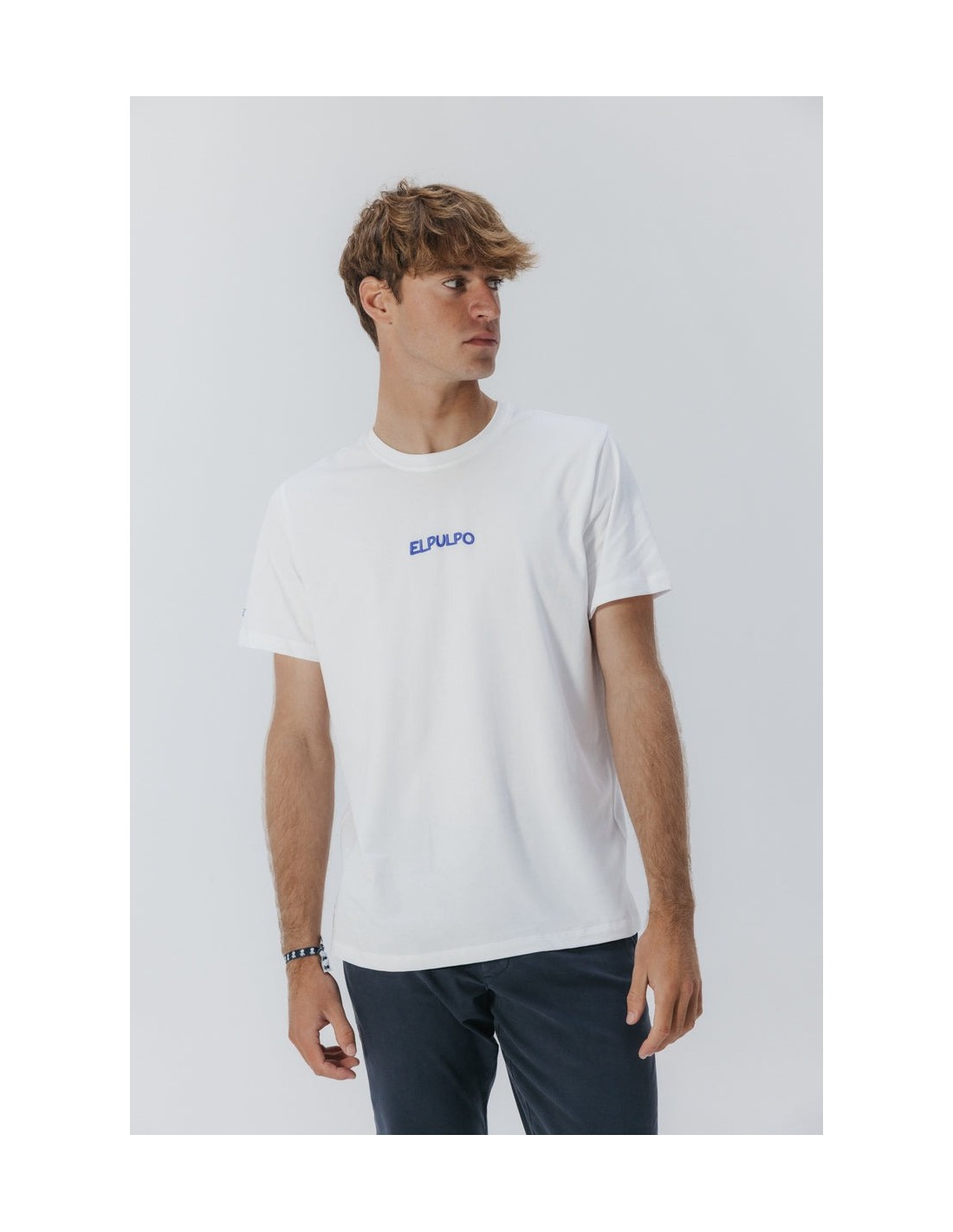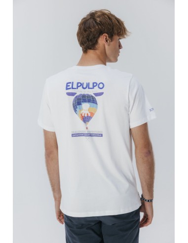 Camiseta de color blanco puro de manga corta confeccionada en algodón orgánico. Cuello redondo y print en la espalda. Regular fit.