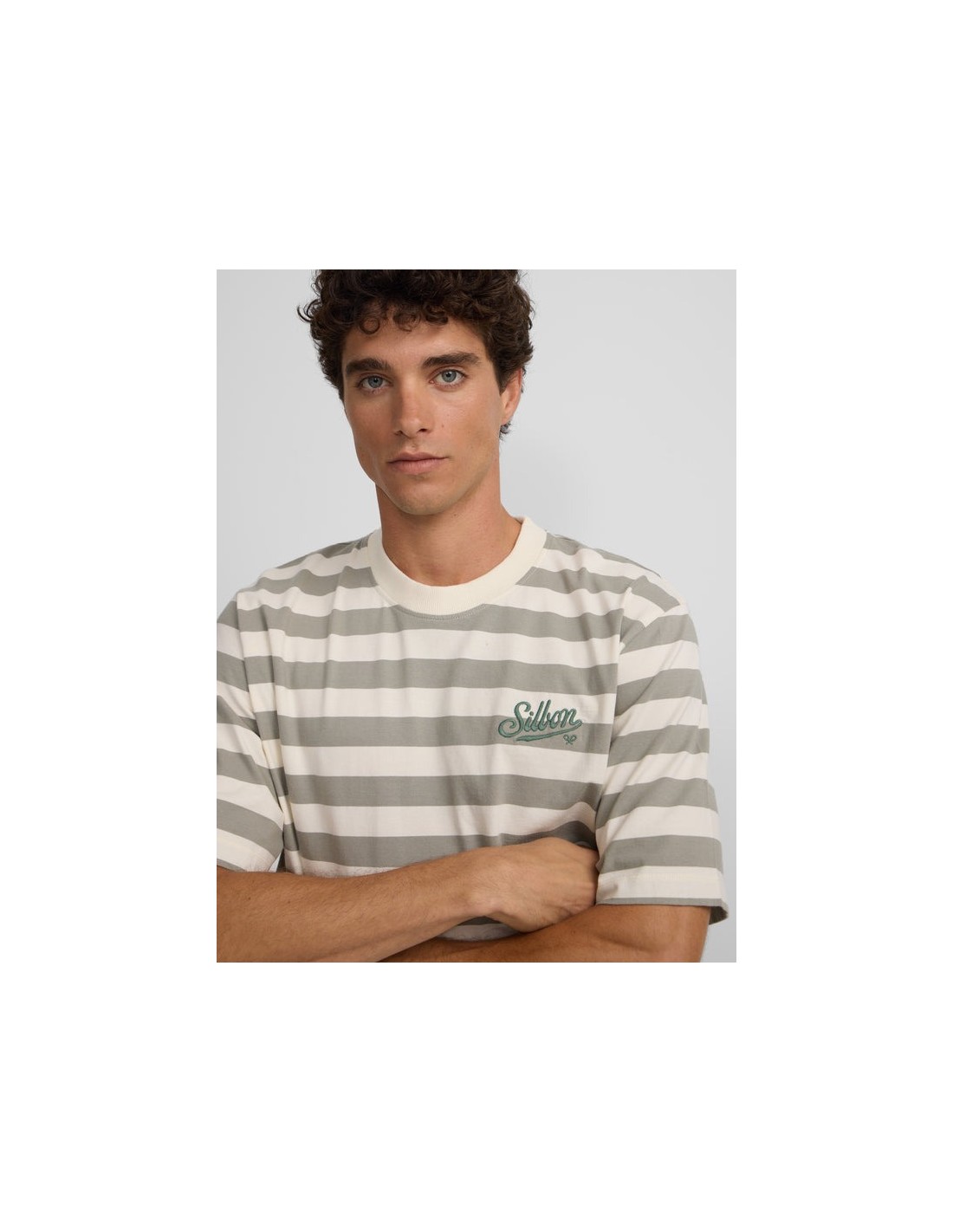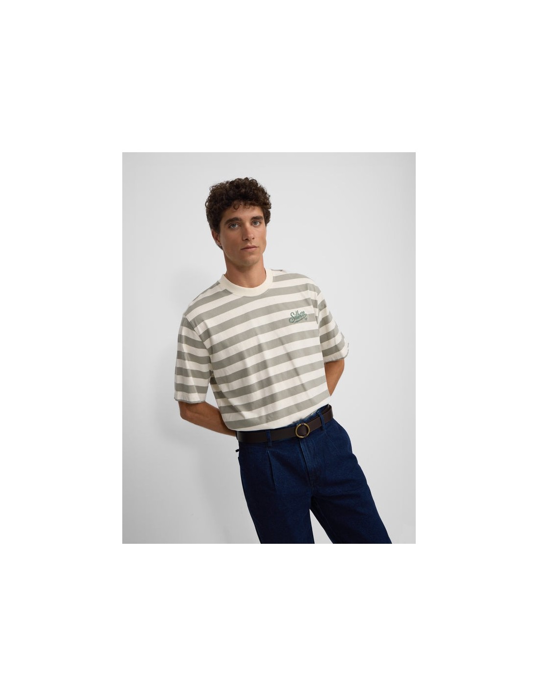 SilbonCamiseta de rayas en tonos verde y crema con patrón Oversize, confeccionada en 100% algodón. Presenta cuello redondo y manga corta. Cuenta con bordado de Silbon y raquetas a contraste en color verde en el torso. Fabricada en Portugal. Nuestro patrón de camisetas "Oversize" cuenta con mangas más anchas, costuras más bajas en los hombros y mayor amplitud en el torso.