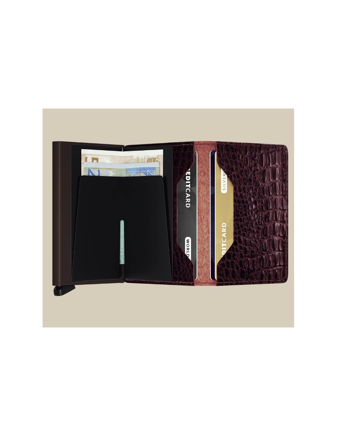 La Slimwallet se caracteriza por su mecanismo patentado, que te permite deslizar las tarjetas con un simple movimiento, presentándolas de forma escalonada para acceder a ellas fácilmente y sin necesidad de abrir toda la cartera. Esta funcionalidad convierte a la Slimwallet en un accesorio moderno, práctico y altamente eficiente.