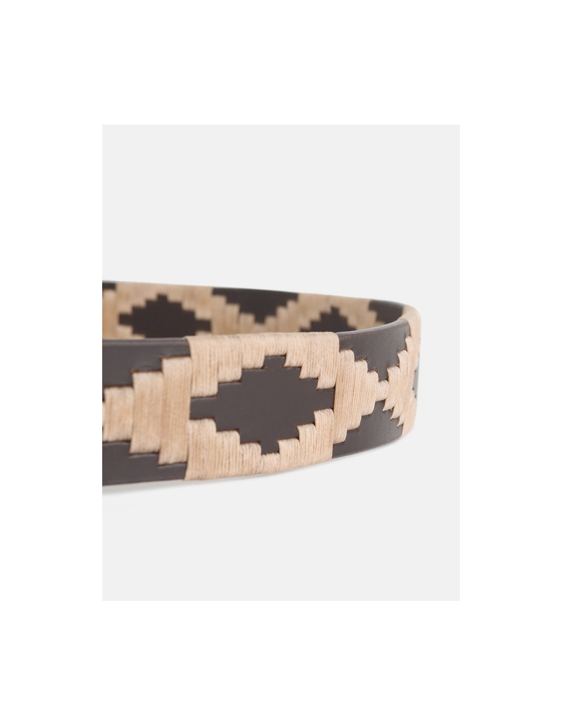 Cinturón de piel argentino en tonos beige y marrón confeccionado en 100% piel. Presenta hebilla metálica en color oro viejo y grabado a fuego de raquetas en el extremo.