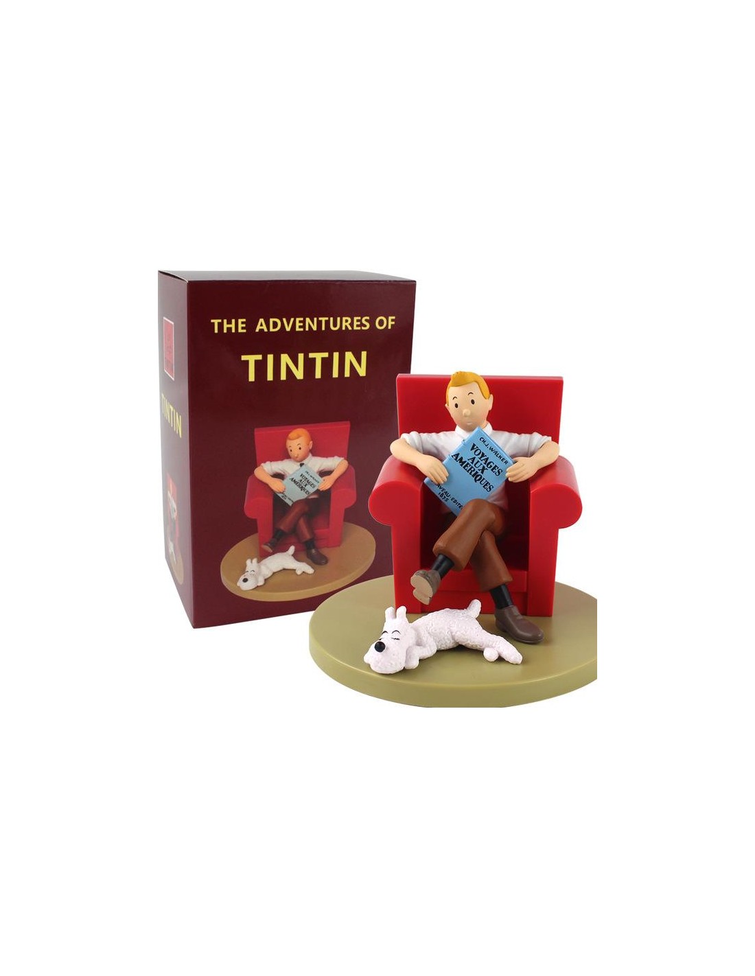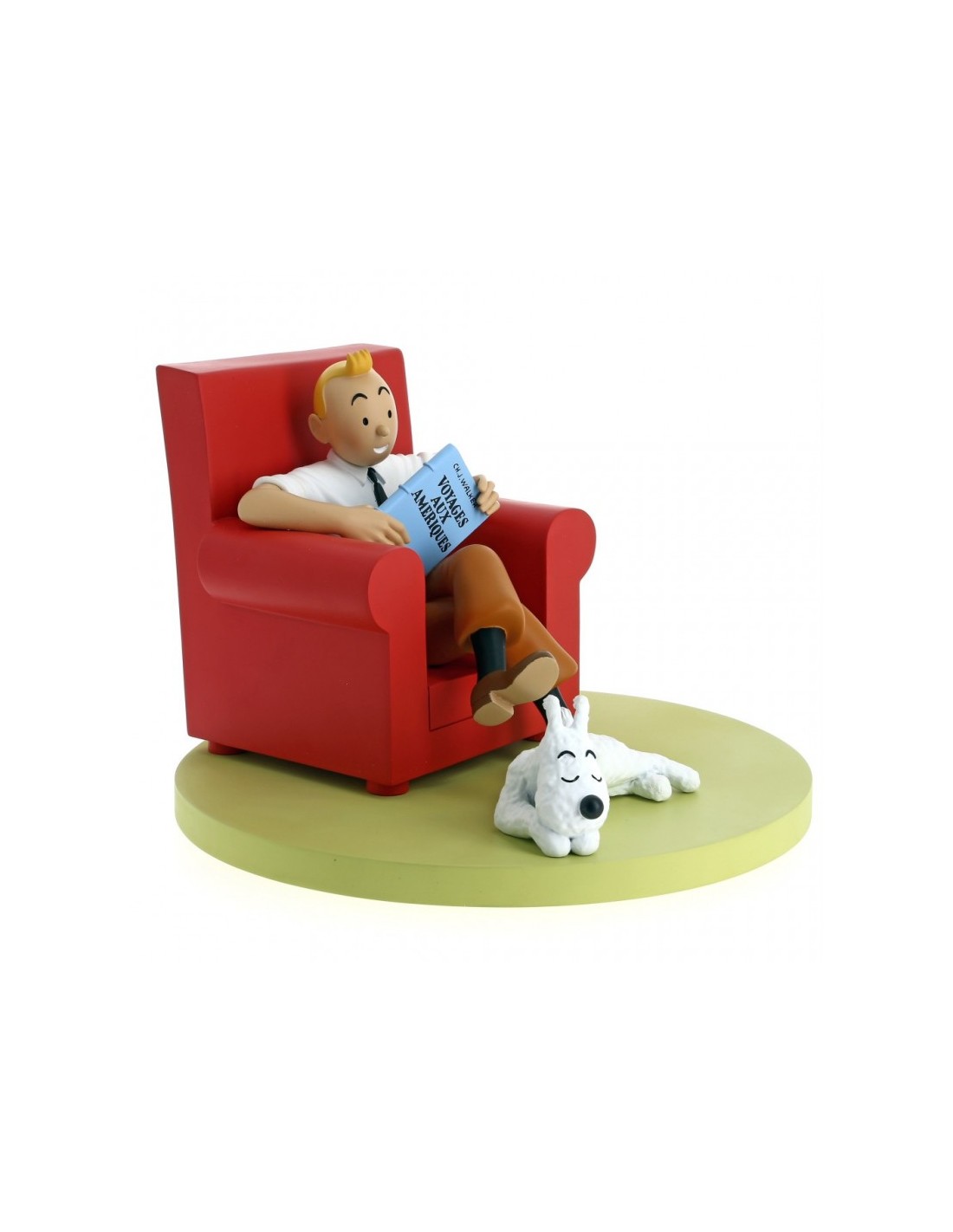 La figura Tintín y Milú Sofá es una representación encantadora de Tintín sentado en su icónico sofá rojo, acompañado por su fiel compañero Milú. Esta escena está inspirada en una viñeta del álbum La Oreja Rota, donde Tintín aparece relajado en su hogar. La figura está fabricada en resina policromada, pintada a mano, y destaca por su atención al detalle y su acabado de alta calidad. Con unas medidas aproximadas de 17 cm de altura y 23 cm de diámetro, esta pieza forma parte de la colección Les Icônes y suele incluir un certificado de autenticidad. Es una obra ideal para coleccionistas y fanáticos del universo de Hergé, que captura la esencia del personaje y su mundo.