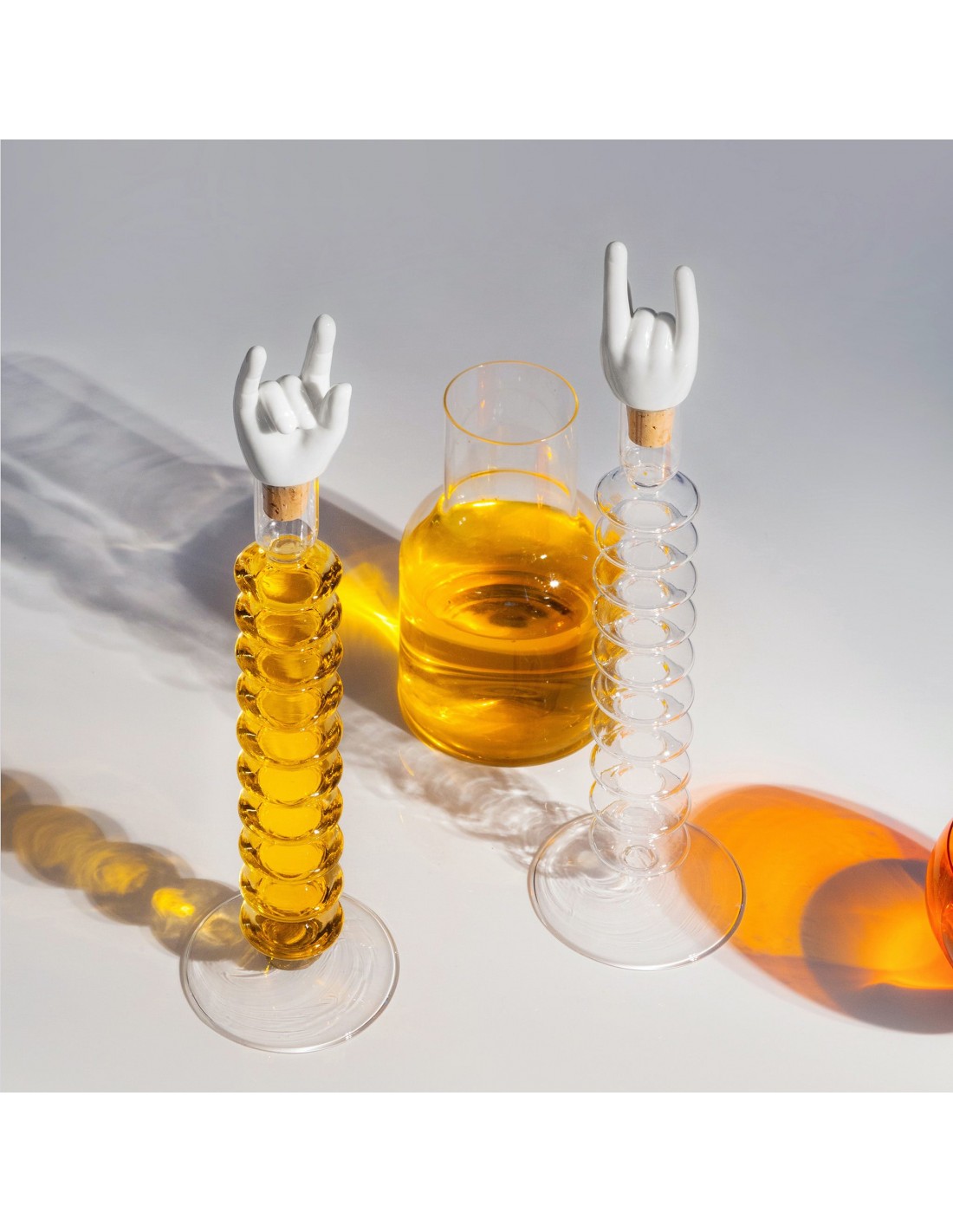 Con un tamaño aproximado de 3 x 4,5 x 10 cm, este tapón destaca por su forma creativa de una mano haciendo el icónico gesto "rock and roll", lo que aporta un aire desenfadado y lleno de personalidad a cualquier celebración o reunión informal.