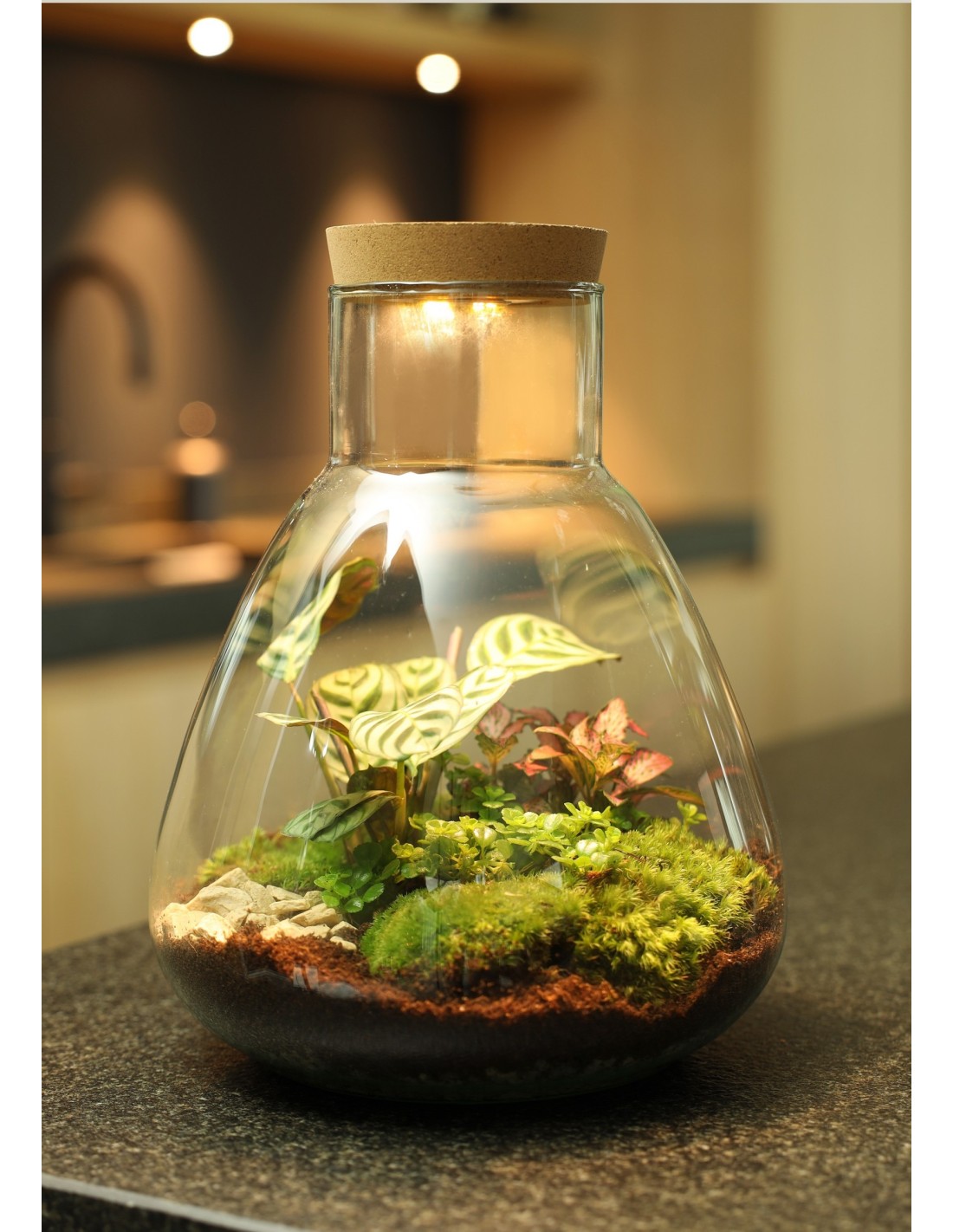 El diseño del Ecosistema Erlenmeijer M se basa en el principio de los ecosistemas cerrados, lo que significa que se reproduce un ciclo natural dentro de un recipiente sellado que permite la regeneración del aire y del agua de forma autónoma. Este ecosistema cerrado crea un microambiente que mantiene las plantas frescas y saludables sin la necesidad de riego o intervenciones regulares. A través de este proceso, el Ecosistema Erlenmeijer M ofrece una solución ecológica para quienes buscan una forma sostenible de disfrutar de la naturaleza dentro de su entorno.