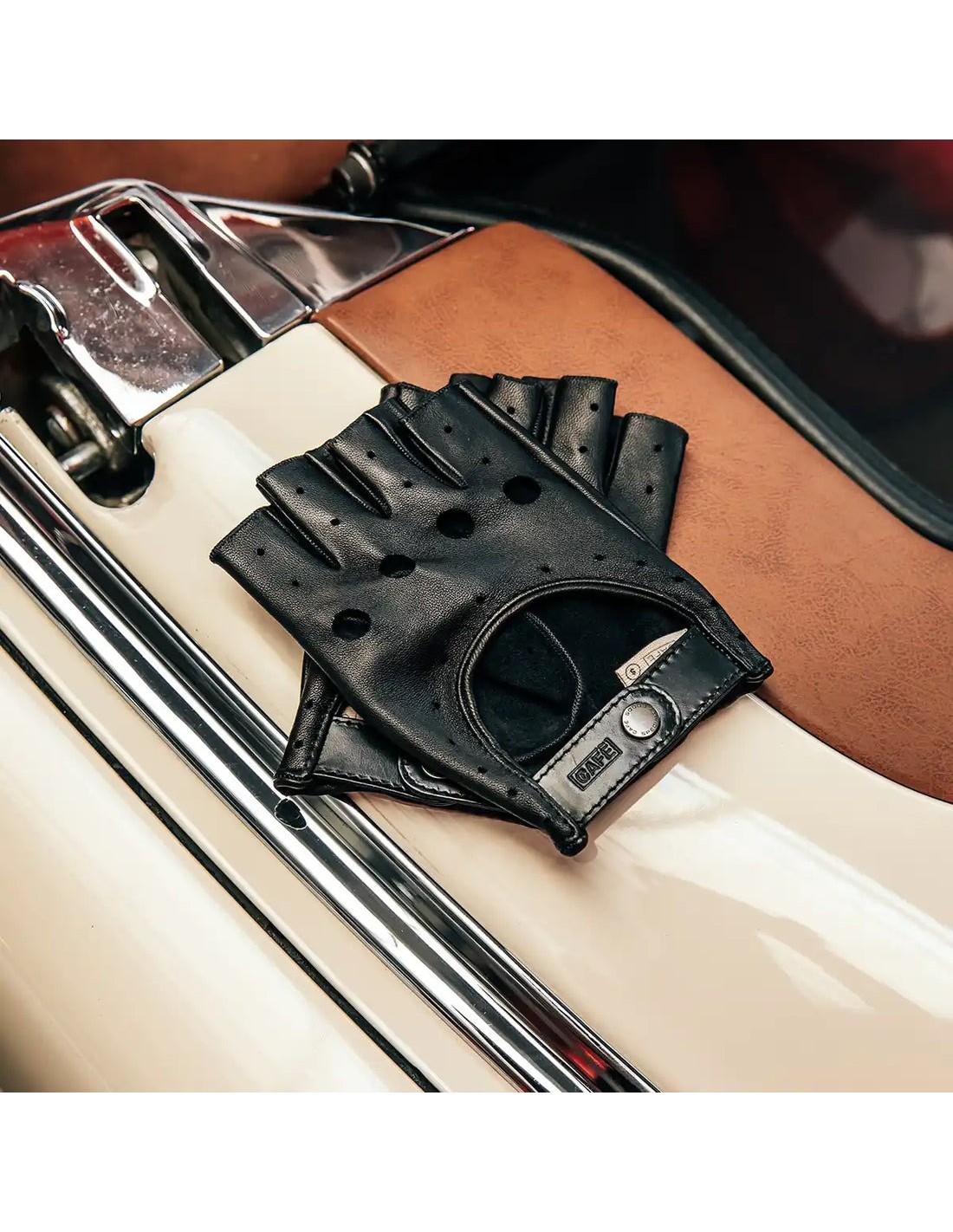 Mitones de conducir «Triton», nuestro icono. Inspirados en las carreras clásicas, estos guantes de conducir son resistentes, y su piel, increíblemente agradable al tacto. Están realizados de manera artesanal con especial cuidado por los pequeños detalles. Su cierre Cobrax Original y su zona elástica en la zona de la muñeca, aportan seguridad y aumentan su confort. La piel perforada, nos permite una mayor transpiración y los dedos recortados nos dan mayor libertad de movimiento. Sin duda, estos guantes de conducir harán las delicias de cualquier apasionado al mundo del motor.