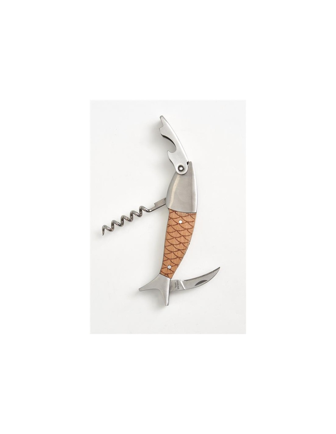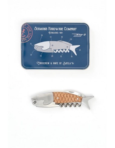 Esta herramienta de doble función no es solo un objeto práctico, sino también una pieza que refleja un gusto por los detalles originales y bien elaborados. Su diseño en forma de pez la convierte en un elemento distintivo que añade un toque de encanto a cualquier ocasión. Su tamaño compacto la hace fácil de transportar y guardar, siempre lista para ser utilizada cuando se necesite una navaja o un sacacorchos.