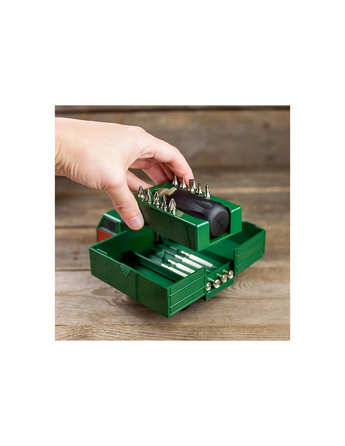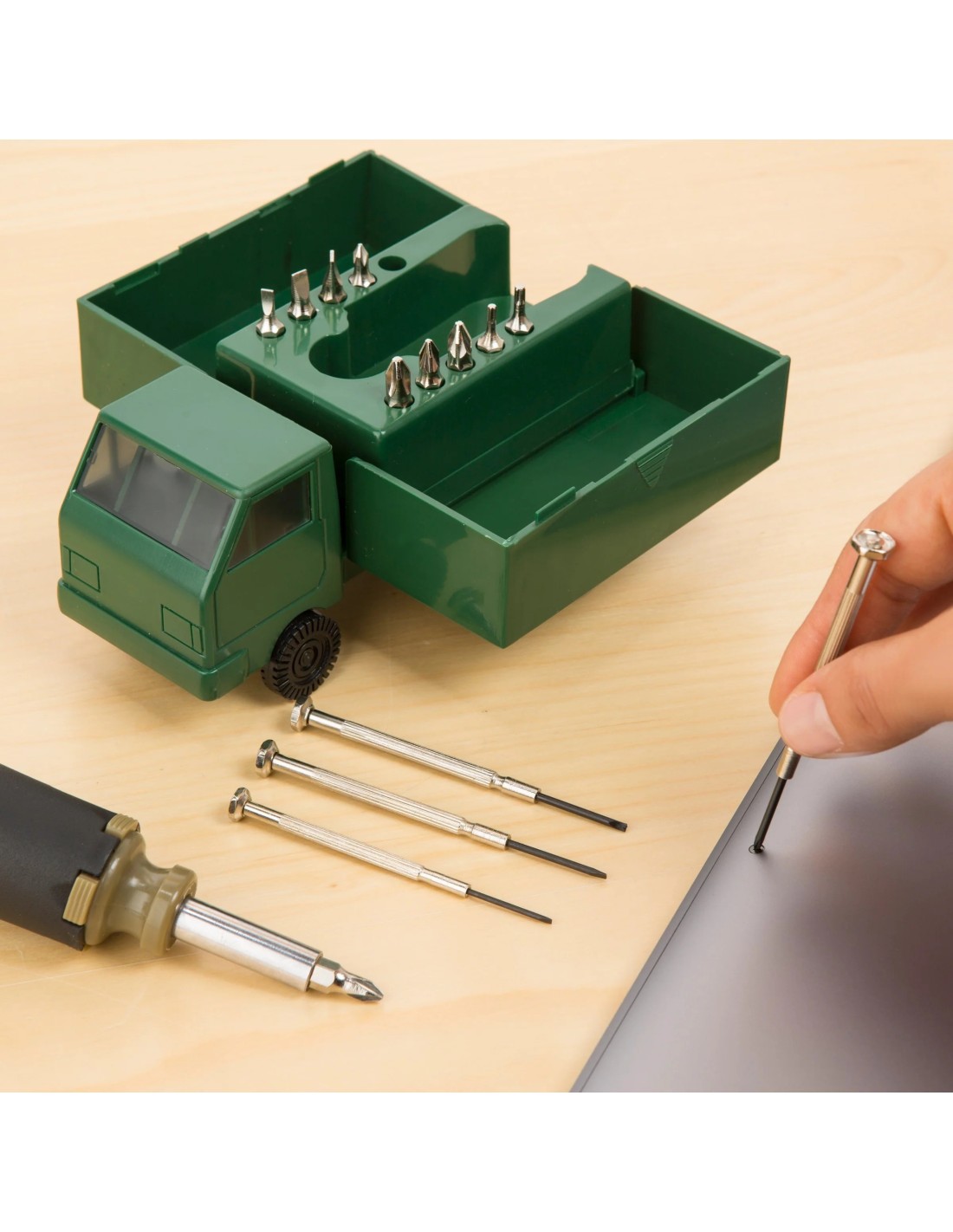 Contiene un juego de destornilladores de 10 bits y 4 destornilladores de precisión.