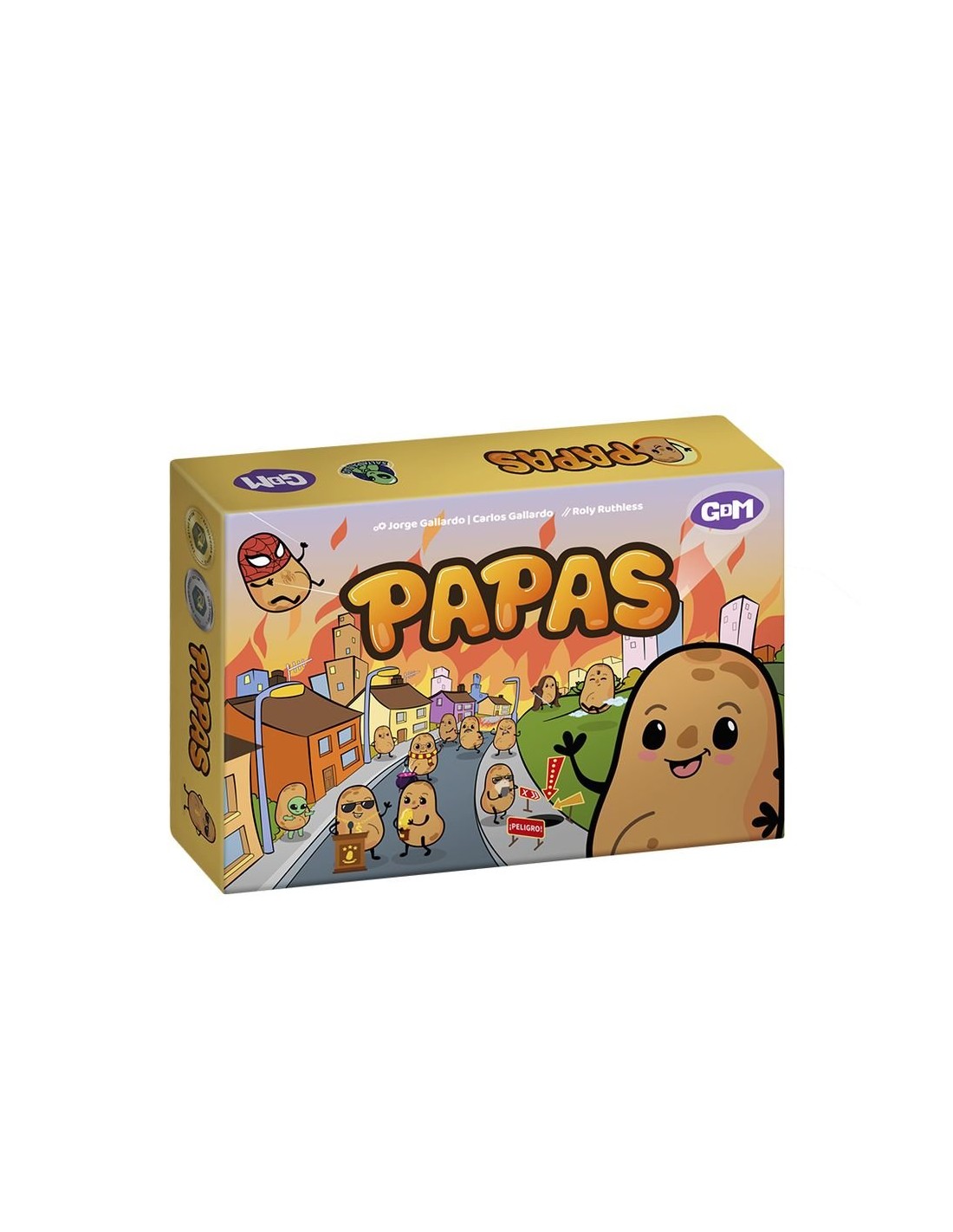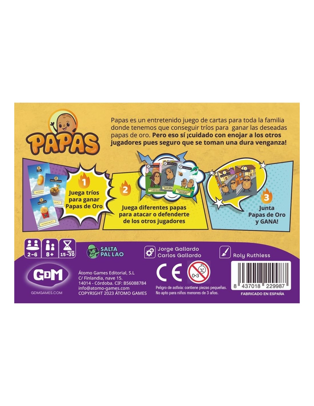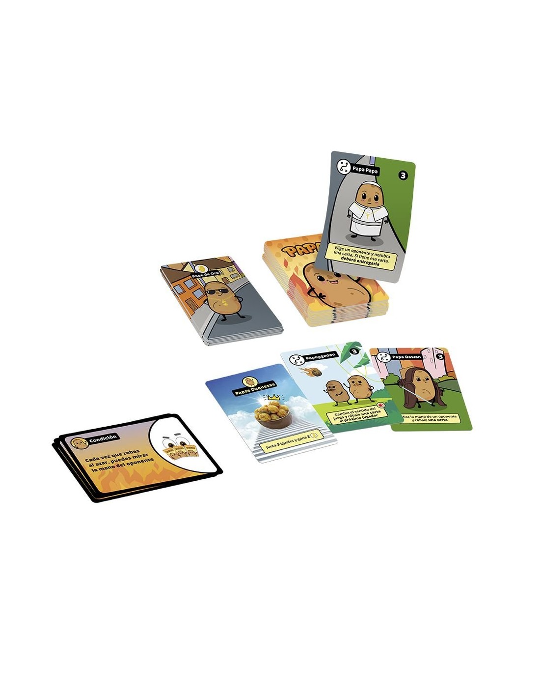 Papas es un entretenido juego de cartas familiar de 2 a 6 jugadores, en el cual tendrás que juntar la mayor cantidad de Papas de Oro. Para esto tendrás que jugar papas para atacar o defenderte, pero son cualquier papas? Podrás jugarle el Papageddon a tus contrincantes, o pelear con Papa Dawan, ya que todas las cartas vienen personalizadas y con habilidades únicas. ¿Eres fanático de las papas? Al fin un juego rompeamistades para ti.