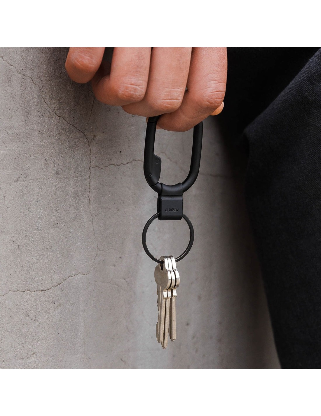 Un mosquetón minimalista con perfil delgado y llavero de liberación rápida.