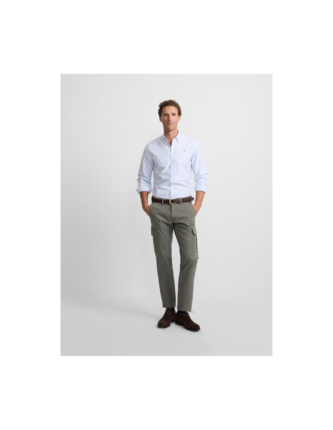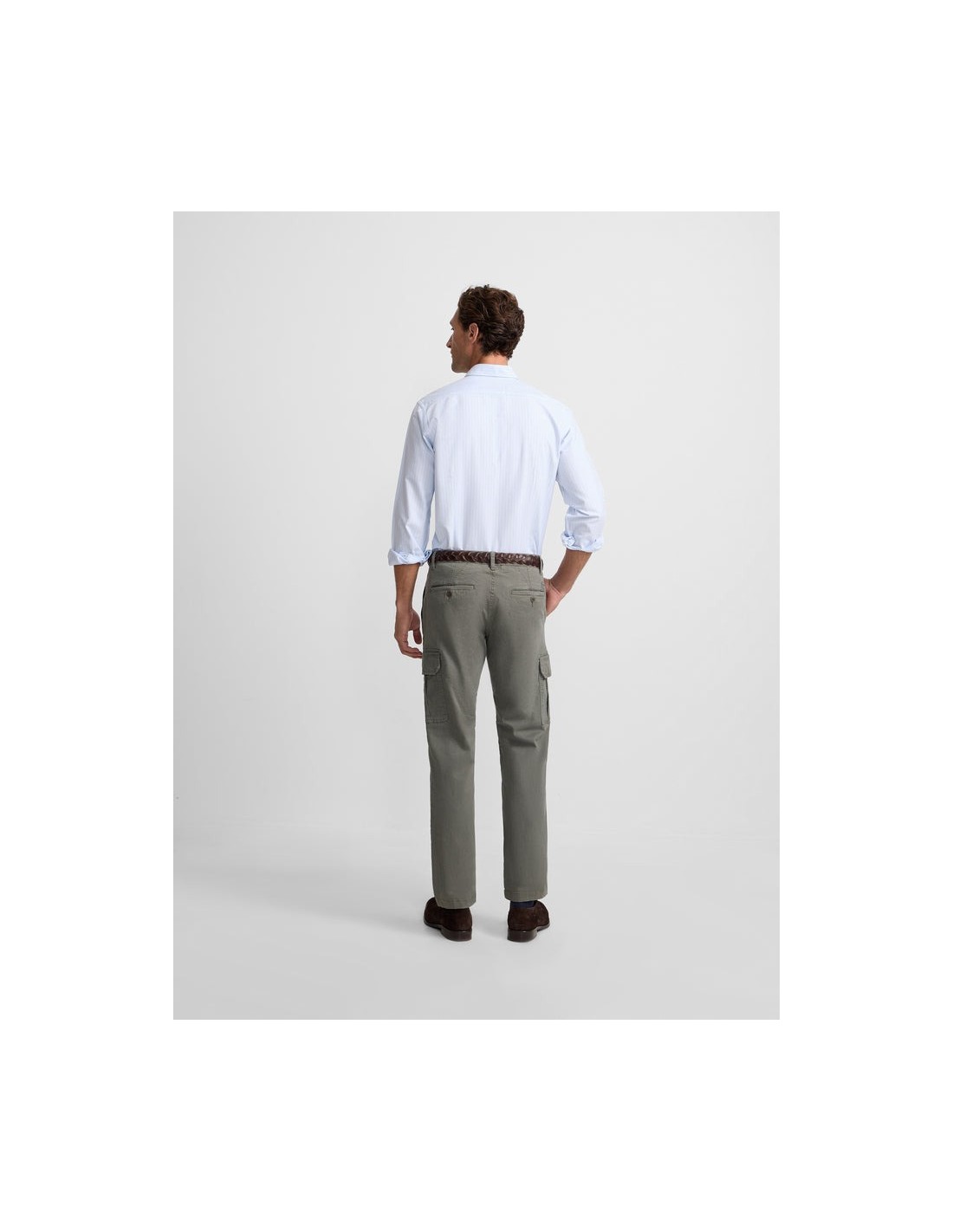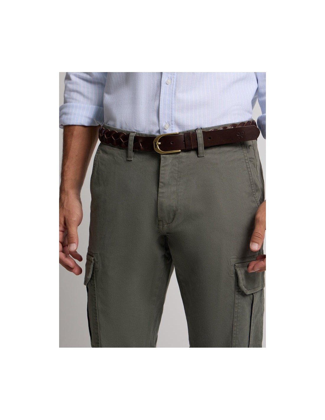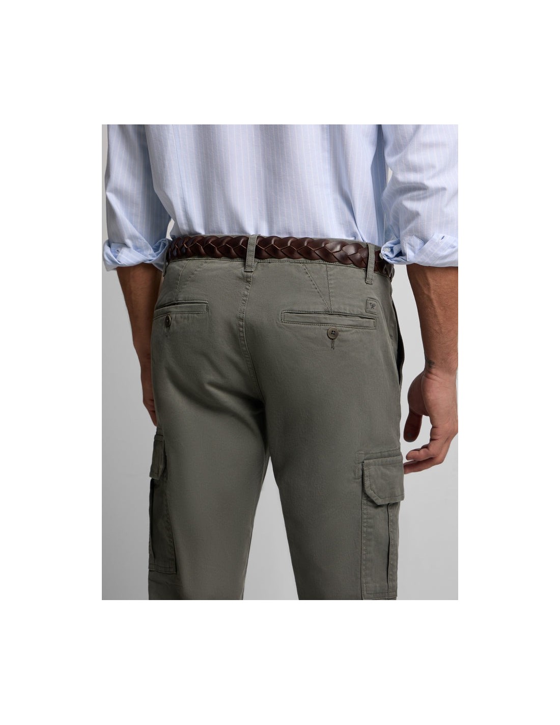 Pantalón cargo casual verde confeccionado en mezcla de algodón de corte Slim fit. Presenta cierre con botón personalizado y cremallera, trabillas en cintura y bolsillos delanteros, laterales y traseros. Cuenta con bordado de raquetas en bolsillo y etiqueta parche de raquetas bordadas traseras.