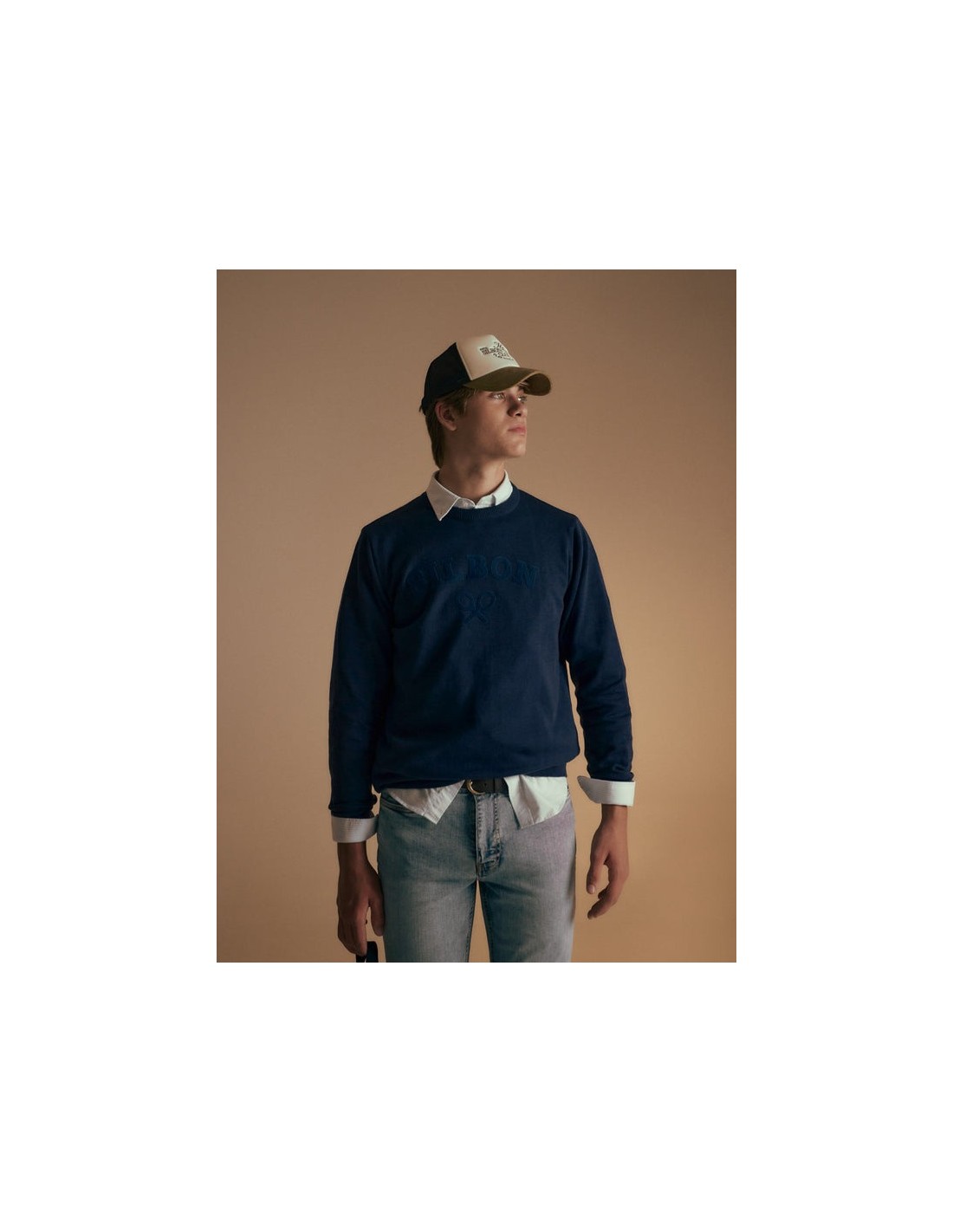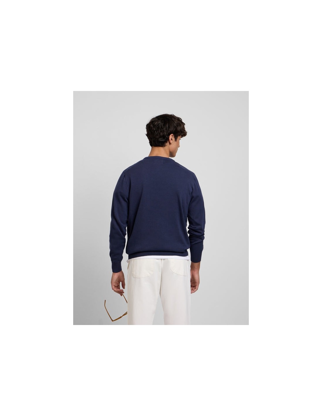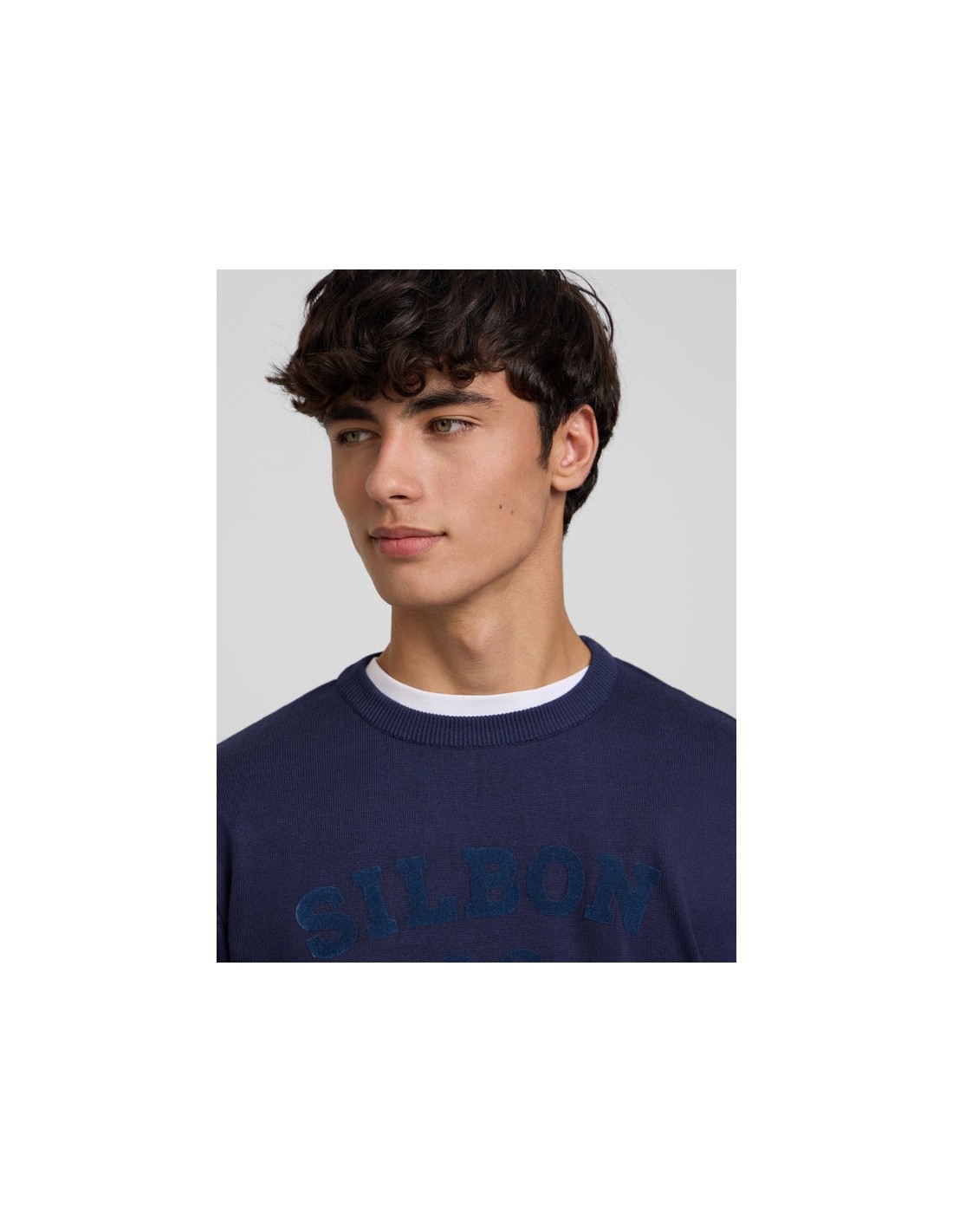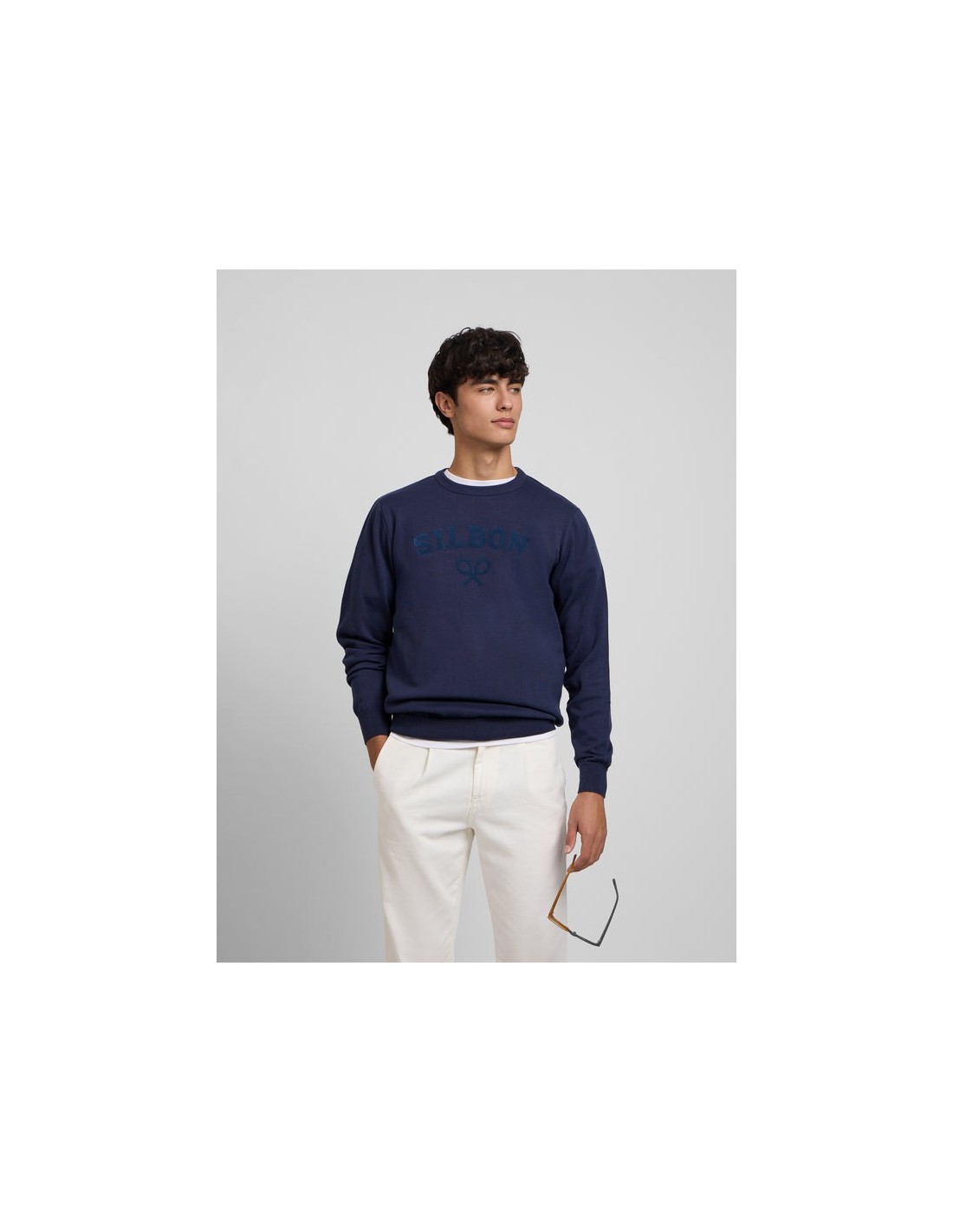 Jersey liso azul marino confeccionado en 100% algodón de corte Regular fit. Presenta cuello redondo y manga larga. Cuenta con bordado de letras y raquetas Silbon en el torso. Fabricado en Portugal.
